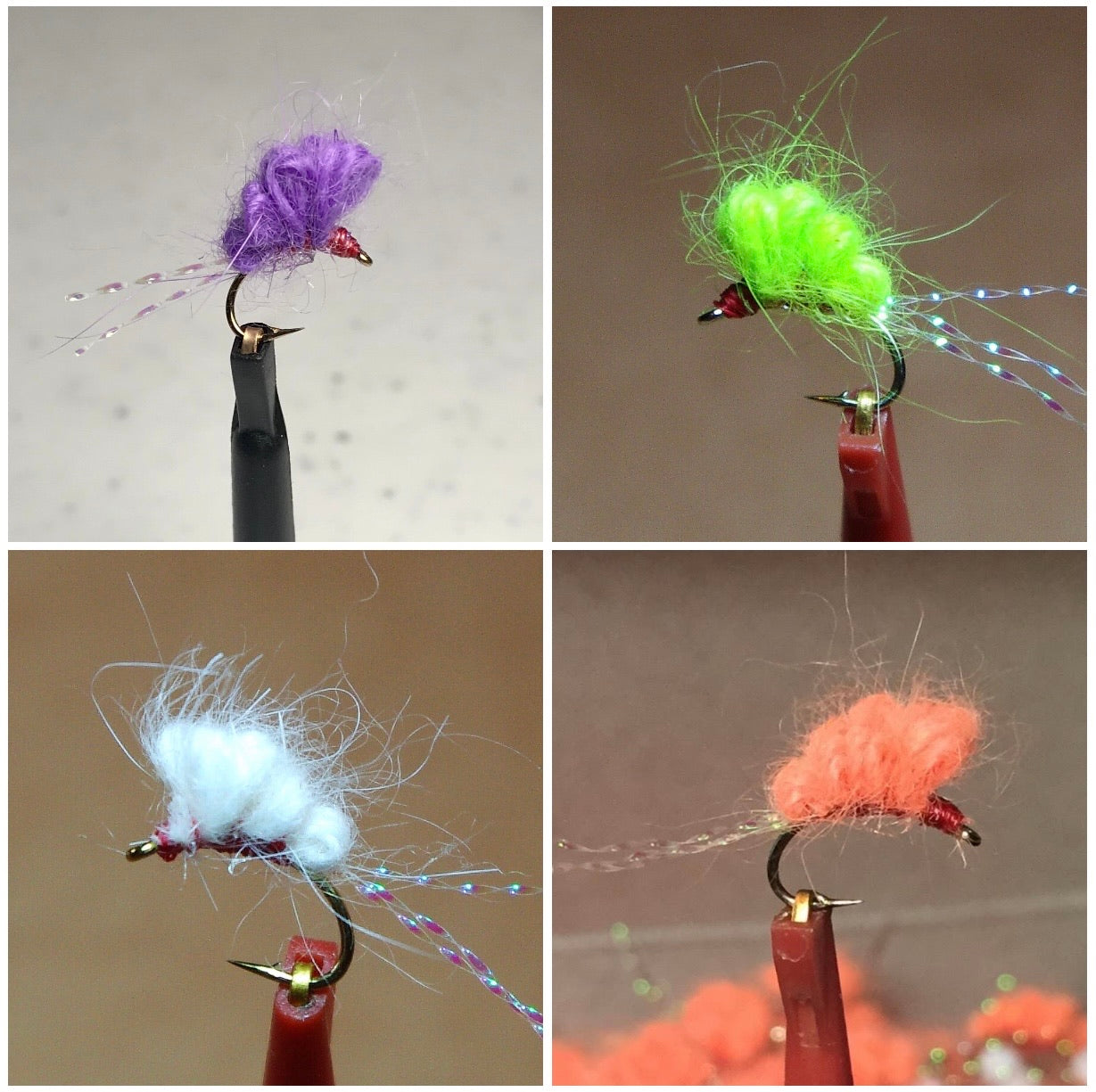 Here is our collection of Sucker Spawn tied on size 14 hooks.